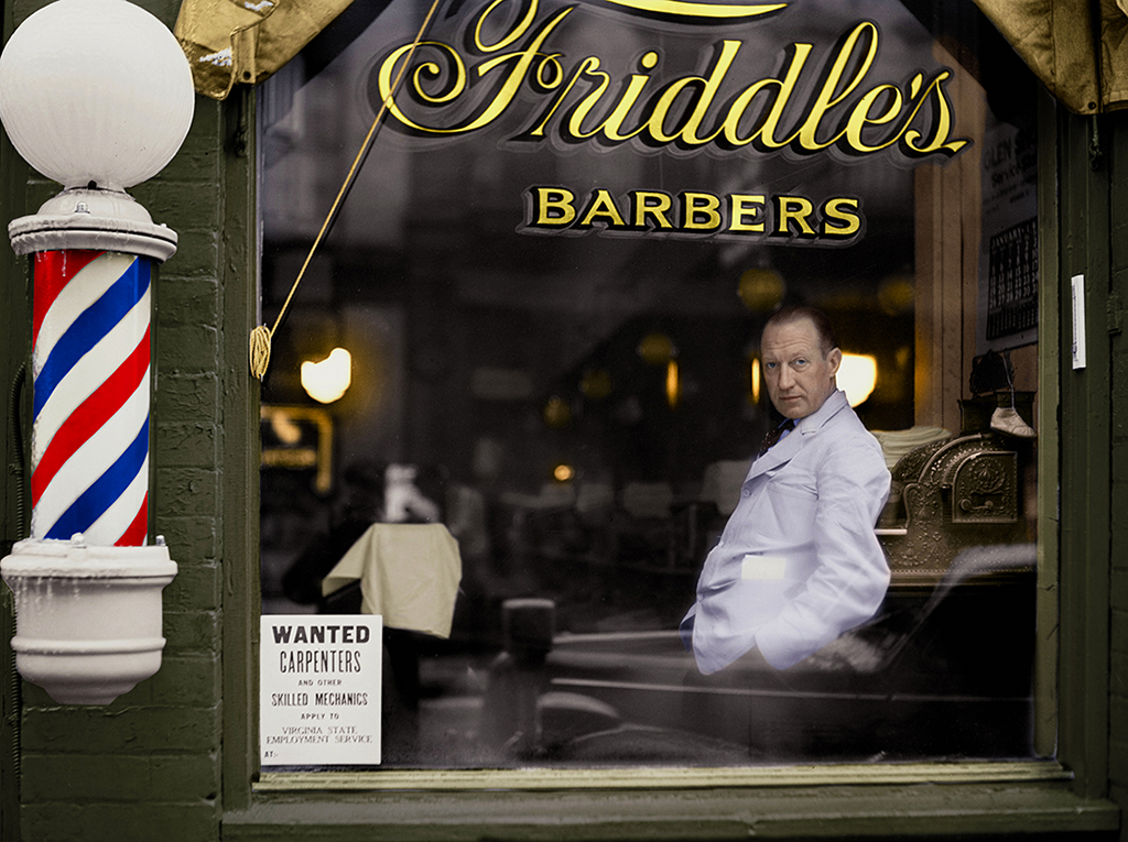 1941 The Barber of Harrisonburg. 2019 © Marie-Lou Chatel Restored and Colorized. Photographer © John Vachon. fsa.8b08998. No known restrictions.
