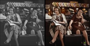 1943 Passengers in the waiting room of the Greyhound bus terminal, Pa. 2019 © Marie-Lou Chatel Restored and Colorized. Photographer © Esther Bubley – fsa-8d32837 No known restrictions.